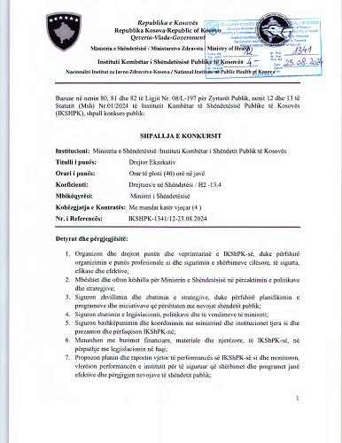 Ministria e Shëndetësisë së fundmi ka hapur konkurs për pranimin e një drejtori ekzekutiv në Institutin Kombëtar të Shëndetësisë Publike në Kosovë, shkruan Gazeta Express.