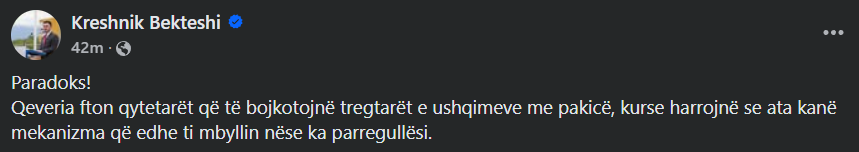 Qeveria fton qytetarët që të bojkotojnë tregtarët e ushqimeve me pakicë, kurse harrojnë se ata kanë mekanizma që edhe ti mbyllin nëse ka parregullsi”, shkruan Bekteshi.